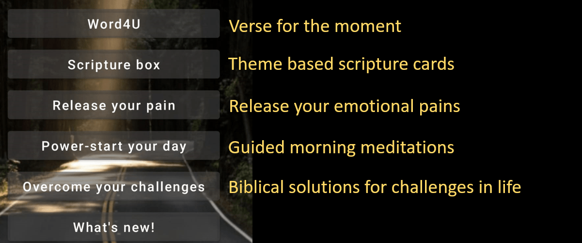 1) You can pick a verse for the moment from the menu option Word4U. You will get a verse that is a blessing or a promise of God.