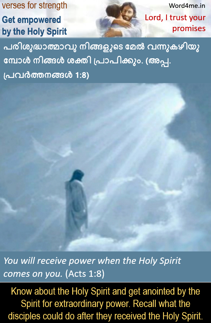 പരിശുദ്ധാത്മാവു നിങ്ങളുടെമേല് വന്നുകഴിയുമ്പോള് നിങ്ങള് ശക്തി പ്രാപിക്കും. (അപ്പ. പ്രവര്ത്തനങ്ങള് 1:8) | You will receive power when the Holy Spirit comes on you. (Acts 1:8)