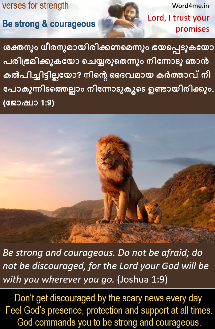 ശക്തനും ധീരനുമായിരിക്കണമെന്നും ഭയപ്പെടുകയോ പരിഭ്രമിക്കു കയോ ചെയ്യരുതെന്നും നിന്നോടു ഞാന് കല്പിച്ചിട്ടില്ലയോ? നിന്റെ ദൈവമായ കര്ത്താവ് നീ പോകുന്നിടത്തെല്ലാം നിന്നോടു കൂടെ ഉണ്ടായിരിക്കും. (ജോഷ്വാ 1:9) | Have I not commanded you? Be strong and courageous. Do not be afraid; do not be discouraged, for the Lord your God will be with you wherever you go. (Joshua 1:9)