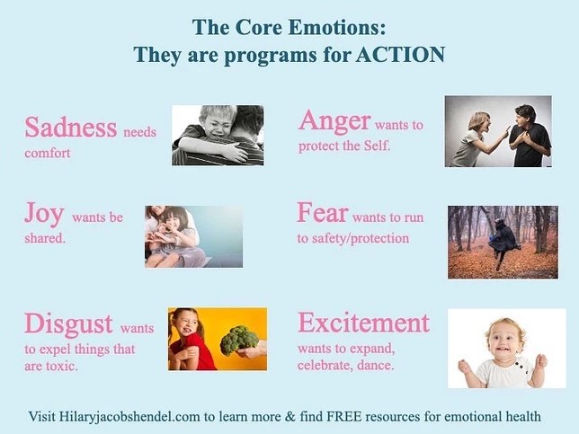 Core emotions are: sadness, fear, anger, joy, excitement and disgust. These emotions inform us about our environment. Am I safe or in danger? What do I need/want and don’t want? Am I sad? Am I hurt? What brings me pleasure? What disgusts me? What excites me?