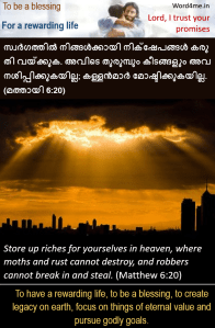 സ്വര്ഗത്തില് നിങ്ങള്ക്കായി നിക്ഷേപങ്ങള് കരുതി വയ്ക്കുക. അവിടെ തുരുമ്പും കീടങ്ങളും അവ നശിപ്പിക്കുകയില്ല; കള്ളന്മാര് മോഷ്ടിക്കുകയില്ല. (മത്തായി 6:20) | Store up riches for yourselves in heaven, where moths and rust cannot destroy, and robbers cannot break in and steal. (Matthew 6:20)
