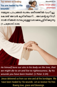 8. നമ്മുടെ പാപങ്ങള് സ്വന്തം ശരീരത്തില് വഹിച്ചു കൊണ്ട് അവന് കുരിശിലേറി. അവന്റെ മുറിവിനാല് നിങ്ങള് സൗഖ്യമുള്ളവരാക്ക പ്പെട്ടിരിക്കുന്നു. (1 പത്രോസ് 2:24) | He himself bore our sins in his body on the tree, that we might die to sin and live to righteousness. By his wounds you have been healed. (1 Peter 2:24)