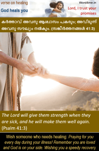 12. കര്ത്താവ് അവനു ആശ്വാസം പകരും; അവിടുന്ന് അവനു സൗഖ്യം നല്കും. (സങ്കീര്ത്തനങ്ങള് 41:3) | The Lord will give them strength when they are sick, and he will make them well again. (Psalm 41:3)
