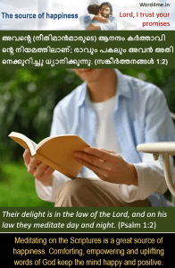 അവന്റെ (നീതിമാന്മാരുടെ) ആനന്ദം കര്ത്താവിന്റെ നിയമത്തിലാണ്; രാവും പകലും അവന് അതിനെക്കുറിച്ചു ധ്യാനിക്കുന്നു. (സങ്കീര്ത്തനങ്ങള് 1:2) | Their delight is in the law of the Lord, and on his law they meditate day and night. (Psalm 1:2)