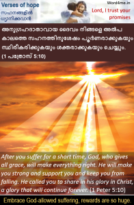 അനുഗ്രഹദാതാവായ ദൈവം നിങ്ങളെ അല്പകാലത്തെ സഹനത്തിനുശേഷം പൂര്ണരാക്കുകയും സ്ഥിരീകരിക്കുകയും ശക്തരാക്കുകയും ചെയ്യും. (1 പത്രോസ് 5:10) | After you have suffered a little while, he will restore, support, and strengthen you, and he will place you on a firm foundation. (1 Peter 5:10)