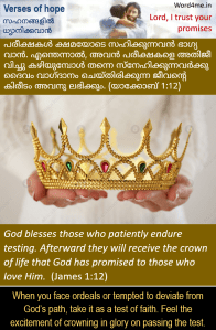 പരീക്ഷകള് ക്ഷമയോടെ സഹിക്കുന്നവന് ഭാഗ്യവാന്. എന്തെന്നാല്, അവന് പരീക്ഷകളെ അതിജീവിച്ചു കഴിയുമ്പോള് തന്നെ സ്നേഹിക്കുന്നവര്ക്കു ദൈവം വാഗ്ദാനം ചെയ്തിരിക്കുന്ന ജീവന്റെ കിരീടം അവനു ലഭിക്കും. (യാക്കോബ് 1:12) | God blesses those who patiently endure testing. Afterward they will receive the crown of life that God has promised to those who love Him. (James 1:12)