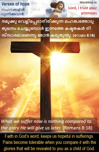 നമുക്കു വെളിപ്പെടാനിരിക്കുന്ന മഹത്വത്തോടു തുലനം ചെയ്യുമ്പോള് ഇന്നത്തെ കഷ്ടതകള് നിസ്സാരമാണെന്നു ഞാന് കരുതുന്നു. (റോമാ 8:18) | What we suffer now is nothing compared to the glory He will give us later. (Romans 8:18)