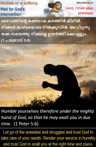 ദൈവത്തിന്റെ ശക്തമായ കരത്തിന്കീഴില്, നിങ്ങള് താഴ്മയോടെ നില്ക്കുവിന്. അവിടുന്നു തക്കസമയത്തു നിങ്ങളെ ഉയര്ത്തിക്കൊള്ളും. (1 പത്രോസ് 5:6) | Humble yourselves therefore under the mighty hand of God, so that he may exalt you in due time. (1 Peter 5:6)