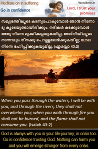 സമുദ്രത്തിലൂടെ കടന്നുപോകുമ്പോള് ഞാന് നിന്നോടു കൂടെ യുണ്ടായിരിക്കും. നദികള് കടക്കുമ്പോള് അതു നിന്നെ മുക്കിക്കളയുകയില്ല. അഗ്നിയിലൂടെ നടന്നാലും നിനക്കു പൊള്ളലേല്ക്കുകയില്ല; ജ്വാല നിന്നെ ദഹിപ്പിക്കുകയുമില്ല. (ഏശയ്യാ 43:2) | When you pass through the waters, I will be with you; and through the rivers, they shall not overwhelm you; when you walk through fire you shall not be burned, and the flame shall not consume you. (Isaiah 43:2)