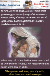 അവന് എന്നെ വിളിച്ചപേക്ഷിക്കുമ്പോള് ഞാന് ഉത്തരമരുളും; അവന്റെ കഷ്ടതയില് ഞാന് അവനോടു ചേര്ന്നു നില്ക്കും; ഞാന് അവനെ മോചിപ്പി ക്കുകയും മഹത്വപ്പെടുത്തുകയും ചെയ്യും. (സങ്കീര്ത്തനങ്ങള് 91:15) | When they call to me, I will answer them; I will be with them in trouble, I will rescue them and honor them. (Psalm 91:15)