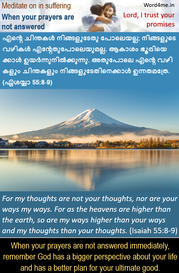 കര്ത്താവ് അരുളിച്ചെയ്യുന്നു: എന്റെ ചിന്തകള് നിങ്ങളുടേതുപോലെയല്ല; നിങ്ങളുടെ വഴികള് എന്റേതു പോലെയുമല്ല. ആകാശം ഭൂമിയെക്കാള് ഉയര്ന്നു നില്ക്കുന്നു. അതു പോലെ എന്റെ വഴികളും ചിന്തകളും നിങ്ങളുടേതിനെക്കാള് ഉന്നതമത്രേ. (ഏശയ്യാ 55:8-9) | For my thoughts are not your thoughts, nor are your ways my ways, says the Lord. For as the heavens are higher than the earth, so are my ways higher than your ways and my thoughts than your thoughts. (Isaiah 55:8-9)