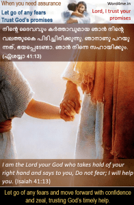നിന്റെ ദൈവവും കര്ത്താവുമായ ഞാന് നിന്റെ വലത്തുകൈ പിടിച്ചിരിക്കുന്നു. ഞാനാണു പറയുന്നത്, ഭയപ്പെടേണ്ടാ. ഞാന് നിന്നെ സഹായിക്കും. (ഏശയ്യാ 41:13) | I am the Lord your God who takes hold of your right hand and says to you, Do not fear; I will help you. (Isaiah 41:13)