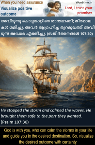 അവിടുന്നു കൊടുങ്കാറ്റിനെ ശാന്തമാക്കി; തിരമാലകള് ശമിച്ചു. അവര് ആഗ്രഹിച്ച തുറമുഖത്ത് അവിടുന്ന് അവരെ എത്തിച്ചു. (സങ്കീര്ത്തനങ്ങള് 107:30) | He stopped the storm and calmed the waves. He brought them safe to the port they wanted. (Psalm 107:30)