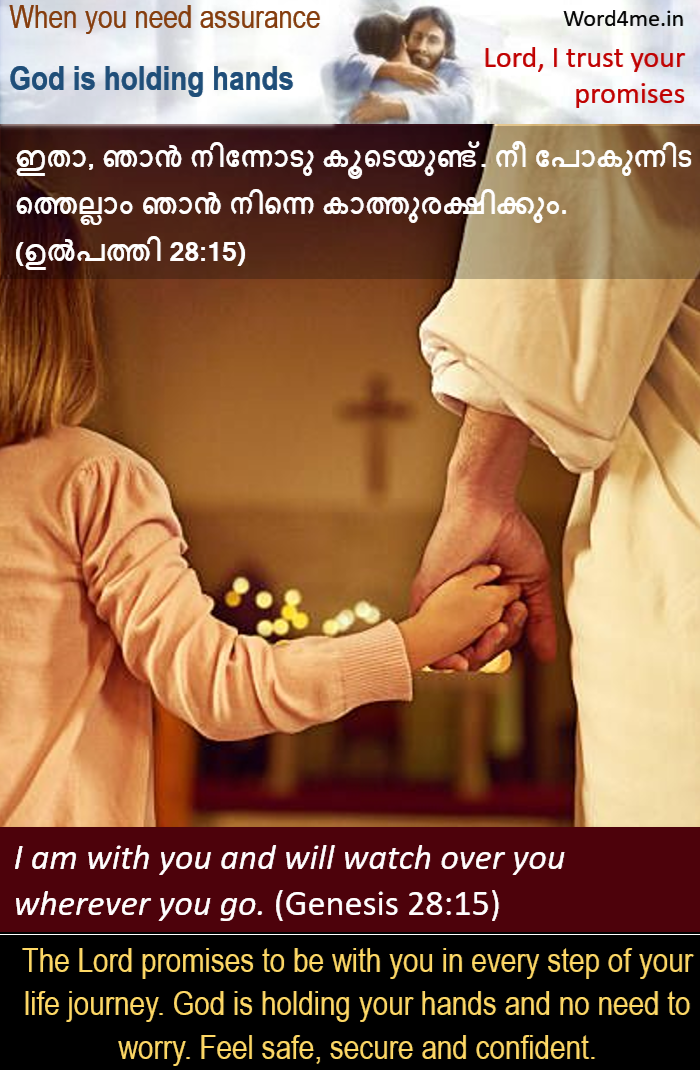 ഇതാ, ഞാന് നിന്നോടു കൂടെയുണ്ട്. നീ പോകുന്നിടത്തെല്ലാം ഞാന് നിന്നെ കാത്തു രക്ഷിക്കും. (ഉല്പത്തി 28:15) | I am with you and will watch over you wherever you go. (Genesis 28:15)