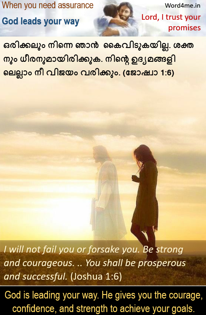 ഒരിക്കലും നിന്നെ ഞാന് കൈവിടുകയില്ല. ശക്തനും ധീരനുമായിരിക്കുക. … നിന്റെ ഉദ്യമങ്ങളിലെല്ലാം നീ വിജയം വരിക്കും. (ജോഷ്വാ 1:6,7) | I will not fail you or forsake you. Be strong and courageous. … You shall be prosperous and successful. (Joshua 1:6,7)