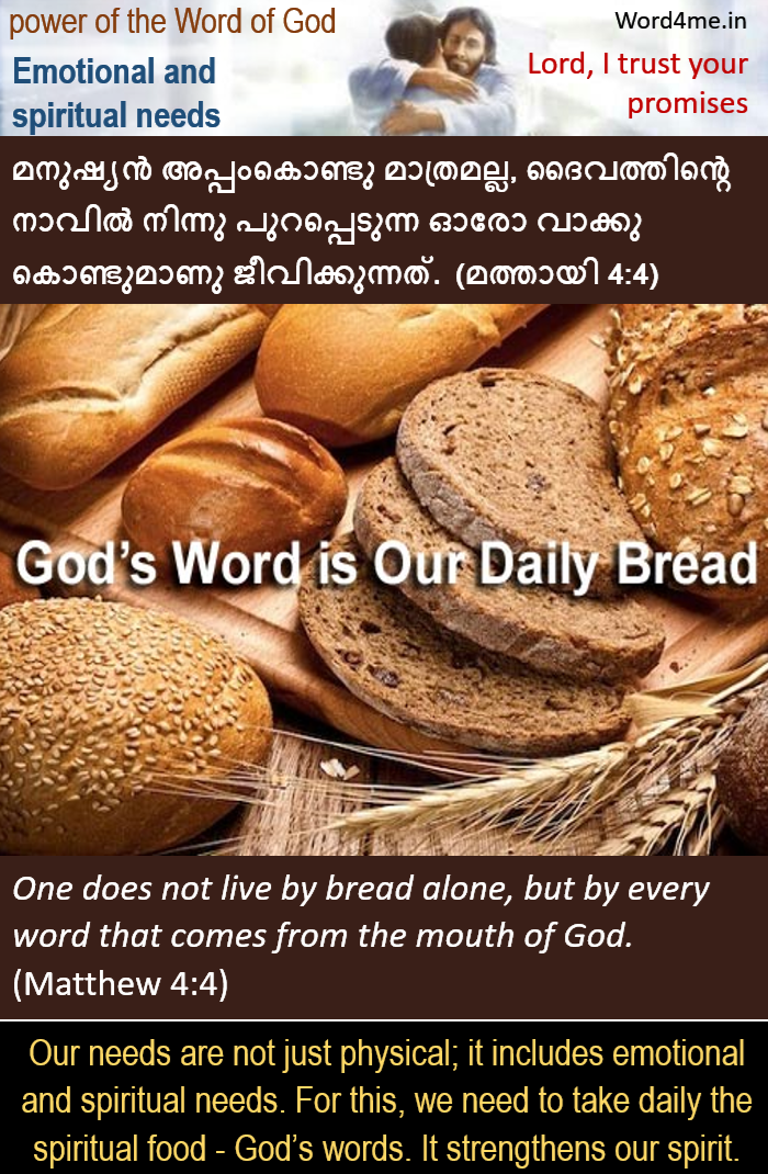 മനുഷ്യന് അപ്പംകൊണ്ടു മാത്രമല്ല, ദൈവത്തിന്റെ നാവില് നിന്നു പുറപ്പെടുന്ന ഓരോ വാക്കുകൊണ്ടുമാണു ജീവിക്കുന്നത്. (മത്തായി 4:4) | One does not live by bread alone, but by every word that comes from the mouth of God. (Matthew 4:4)